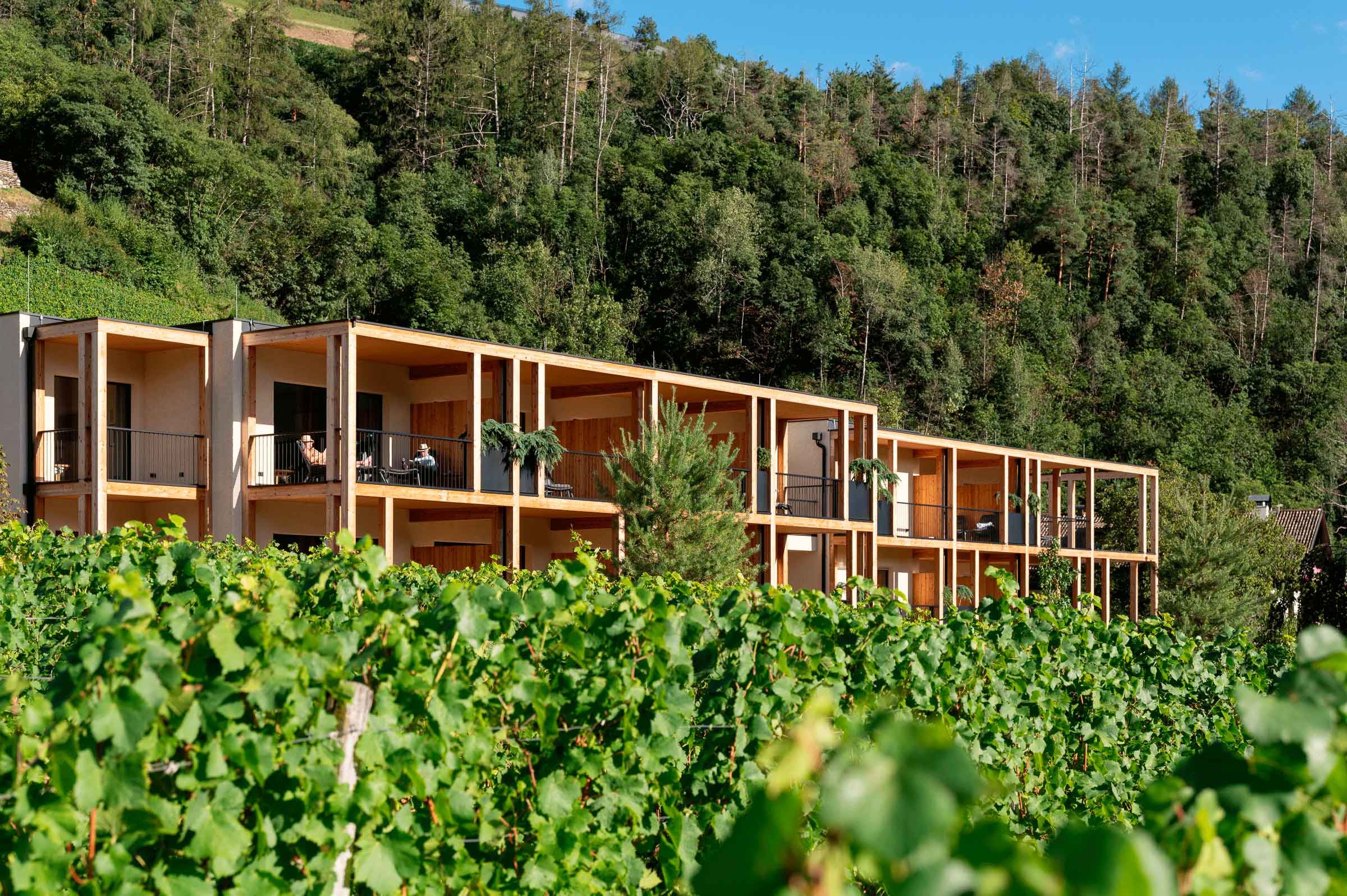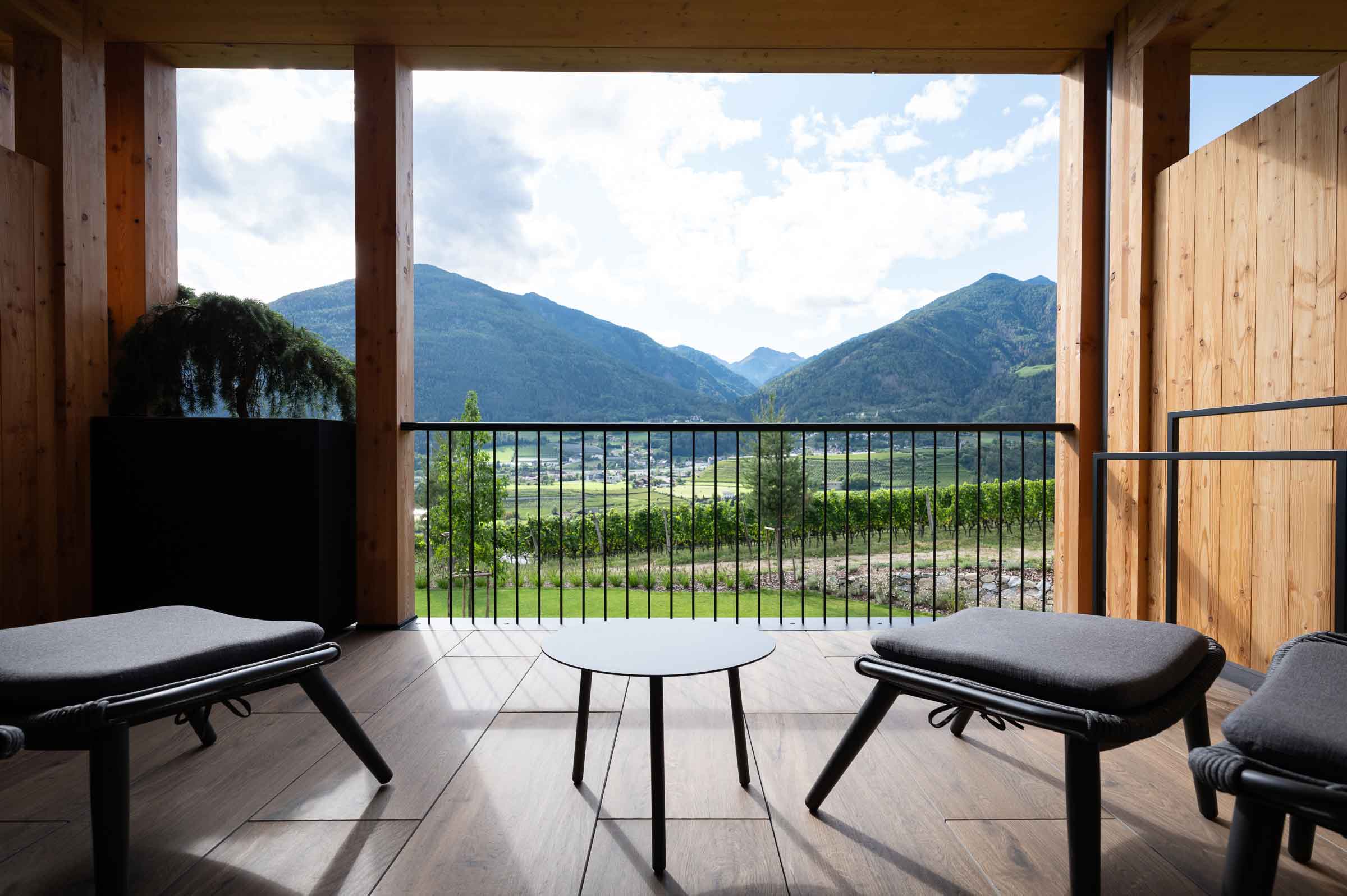 Zur Entspannung lädt der Wellnessbereich ein: Innen- und Außenpool, Sauna, Dampfbad und sanfte Anwendungen mit Naturprodukten lassen den Alltag vergessen und schenken neue Energie. Umgeben von Weinbergen und mit Blick auf das Eisacktal findet jeder Gast seinen persönlichen Ort der Ruhe.
