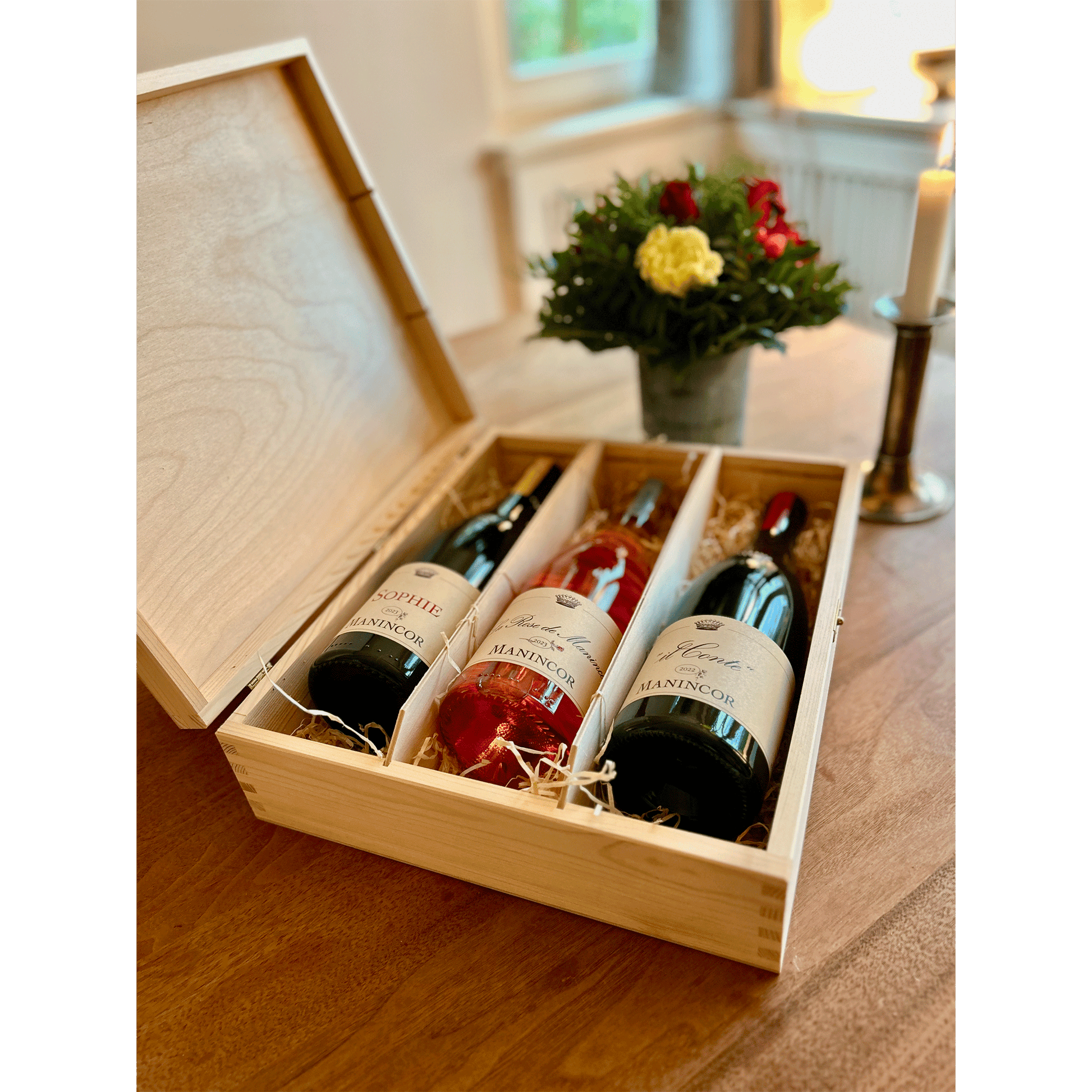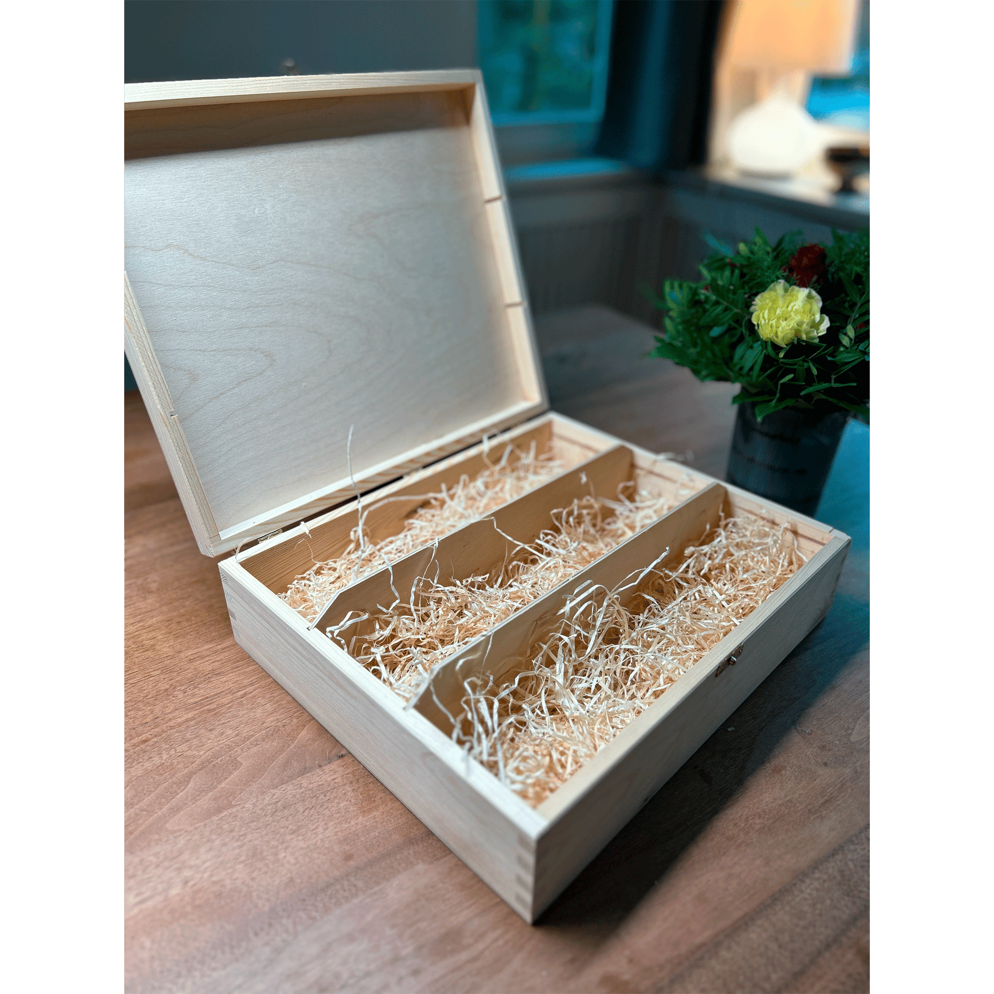 dekorative Holzbox passend für 3 Flaschen aus stabilem Holz mit kleinem Scharnier.